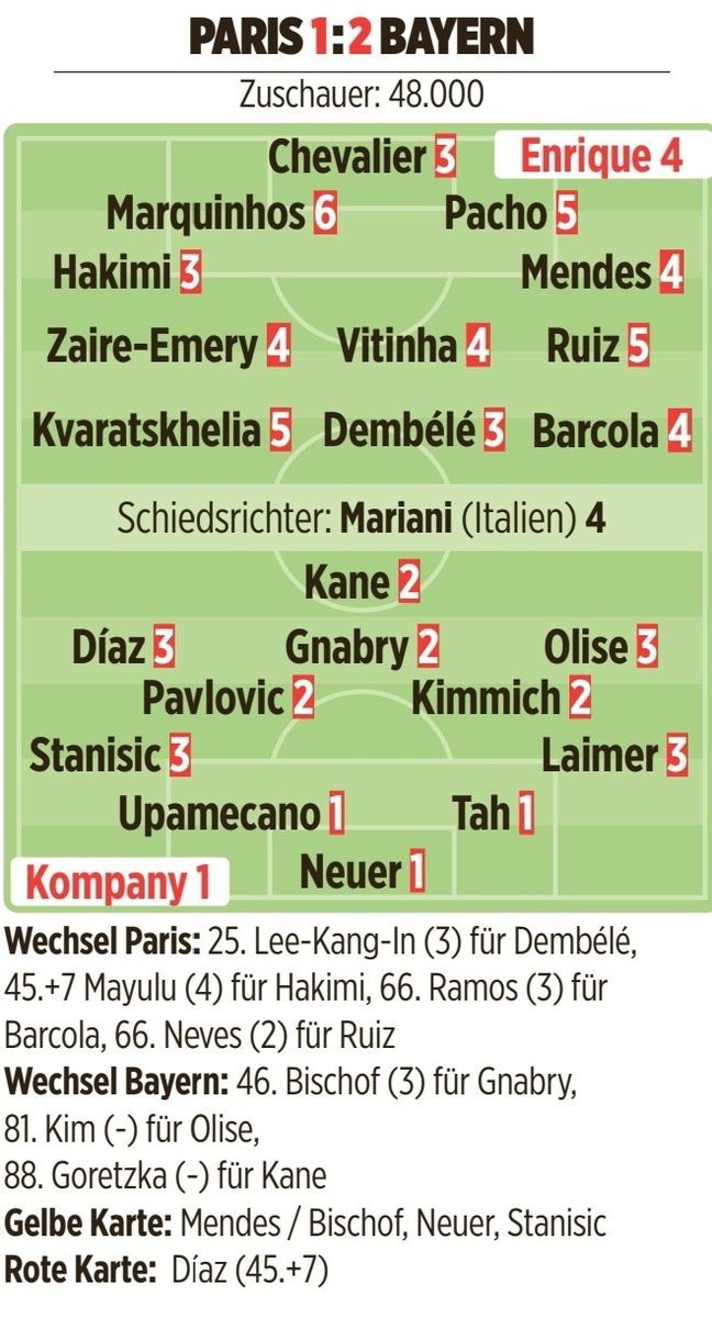 直播吧11月5日讯巴黎在本轮欧冠焦点战主场1-2不敌拜仁,马尔基尼奥斯送礼、迪亚斯双响后染红,《图片报》在赛后为两队进行了评分: