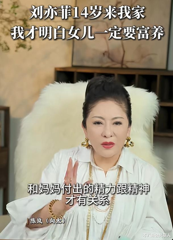 陈岚在个人社交账号公布,刘亦菲14岁时,她妈妈就带着她到香港找到了向太,而向太也是在见到刘亦菲母女之后,才知道刘亦菲是在单亲家庭里长大的孩子。