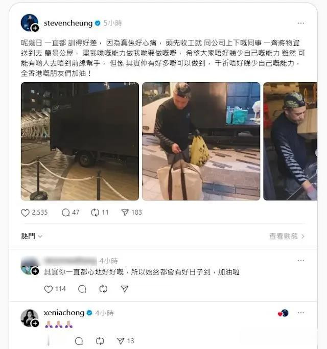 香港大埔宏福苑五级火灾造成超过百人伤亡,全港陷入哀痛之中。各界艺人纷纷伸手援助,而张致恒也悄悄尽一份力。他在社交平台上传多张搬运物资的照片,画面中他与公司同事登上货车,车上堆满物资,正将物品搬到简易公屋供灾民使用。从表情看得出他投入且认真,完全没有明星架子。