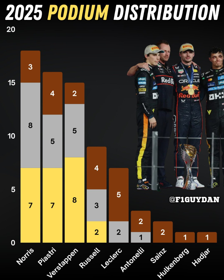 虎扑12月10日讯据F1数据专家瓦伦特统计,2025年F1的24场大奖赛上周全部结束,72个领奖台位置的分布呈现了一些有趣的观察结果: